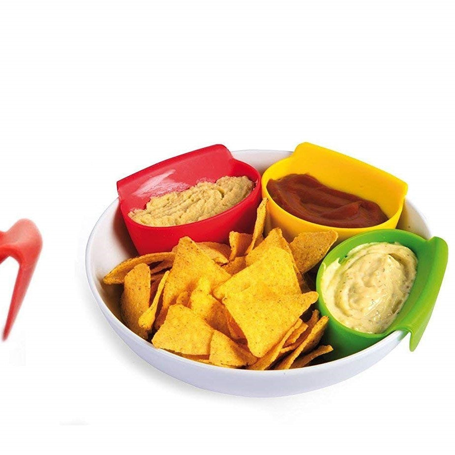 - This Chip Dip Set of 3 silicone bowls in bright colors that clip onto bowls is perfect for guacamole, salsa, dressings, and any dips of your choice.