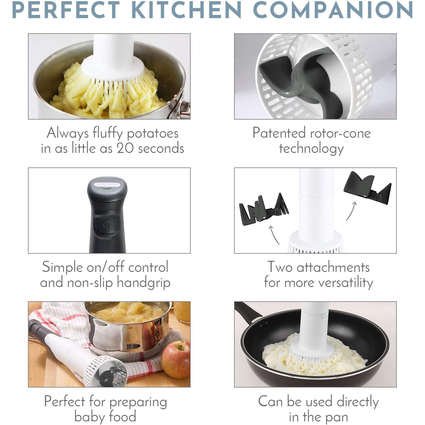 - THE ULTIMATE MULTI-USE FOOD BLENDER: Our patented rotor blade technology and aerator attachment work on more than just regular potatoes. You can also whip up wonderfully fresh veggies, baby food, soups, sauces, eggs, desserts, and more. It’s soon to become the most versatile appliance in your kitchen and meal prep.